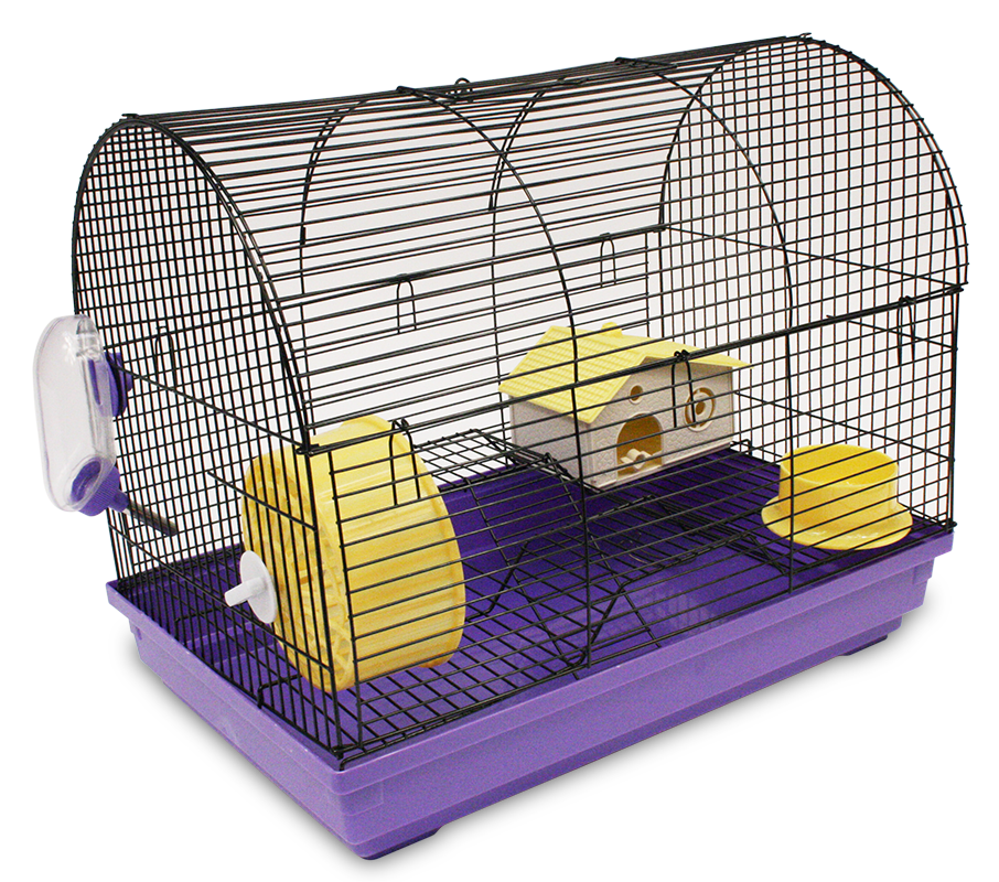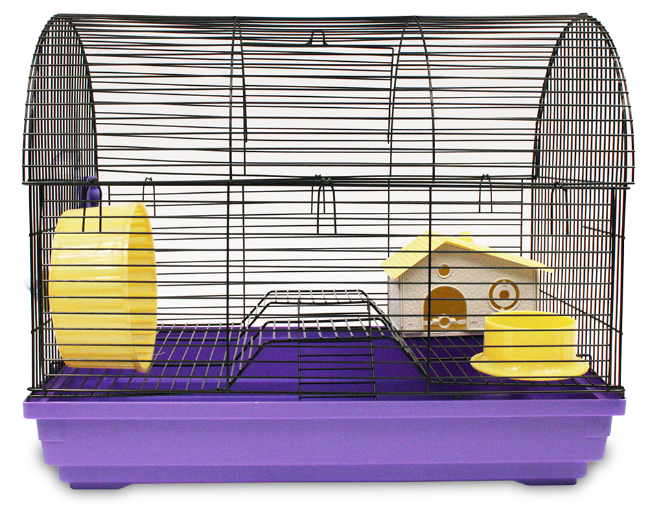 Incluye rueda para hacer ejercicio, dos niveles con rampa, escalera, casa, tazón para alimento y bebedero.