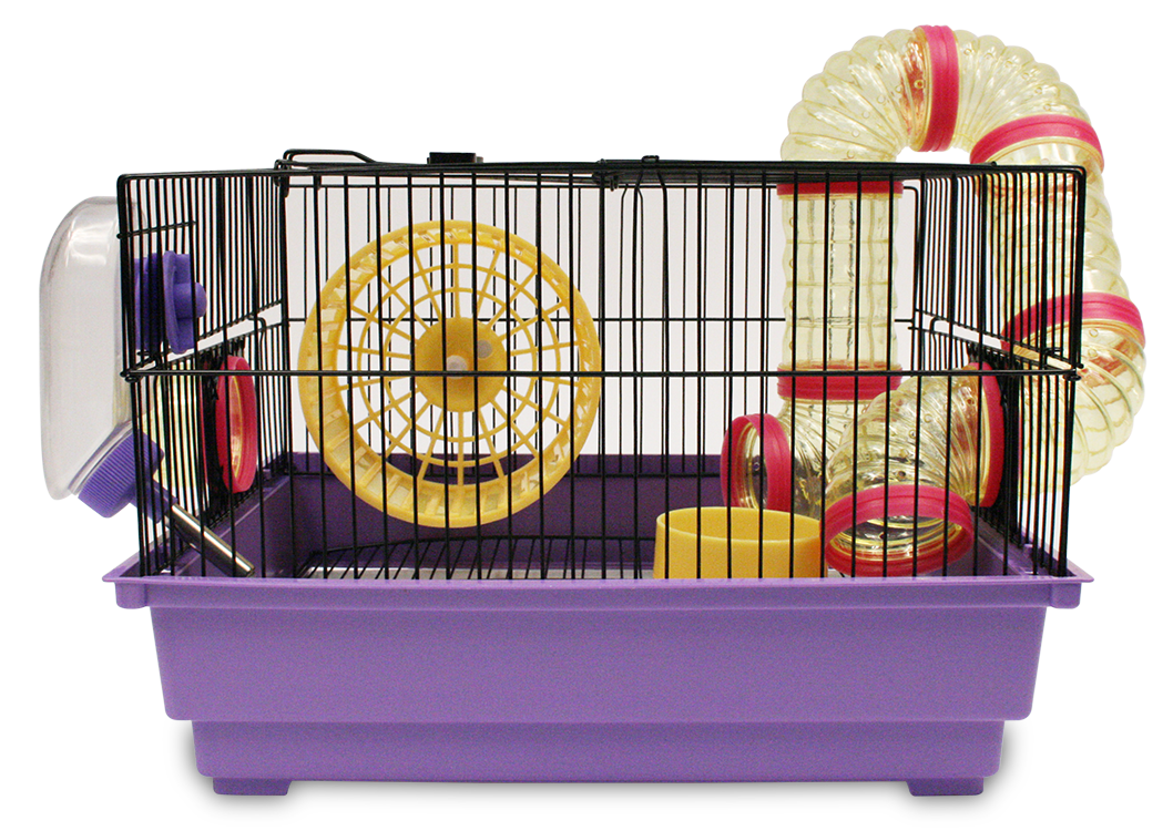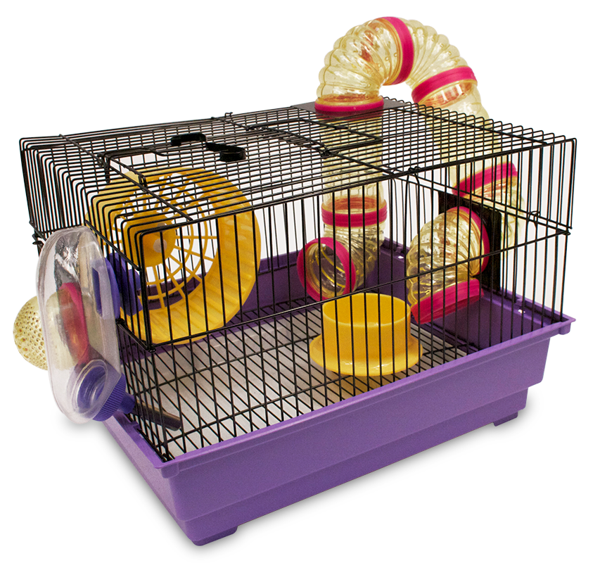 Incluye rueda para hacer ejercicio, dos niveles con rampas, tazón para alimento y bebedero.